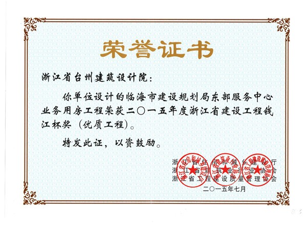 臨海市建設規劃局東部服務中心業務用房工程獲2016括蒼杯獎(優秀勘察設計)三等獎