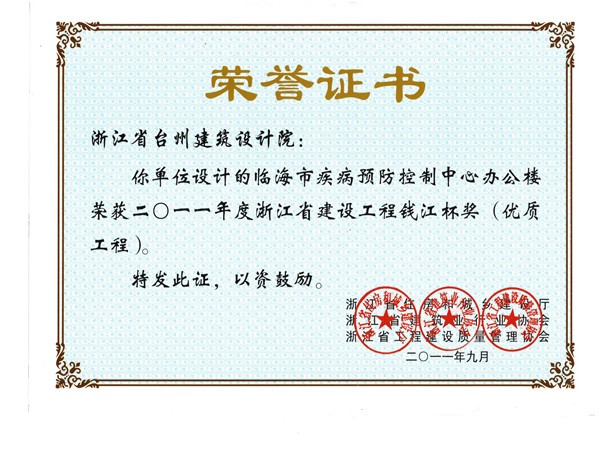 疾病預防控制中心辦公樓獲2011浙江省建設工程錢江杯獎(優質工程)