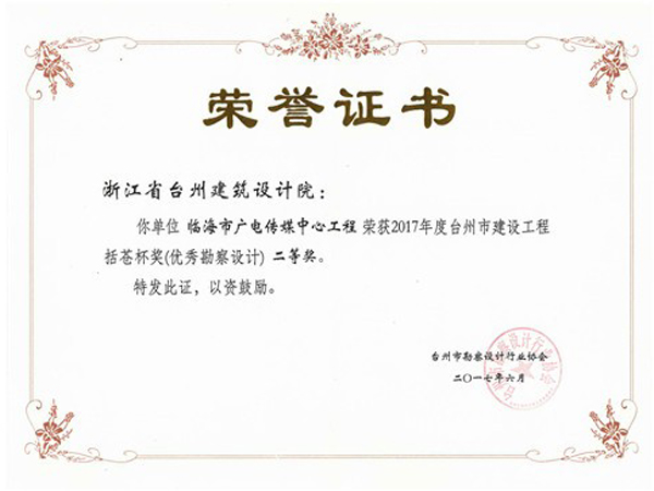 臨海市廣電傳媒中心工程獲2017括蒼杯獎(優秀勘察設計)二等獎